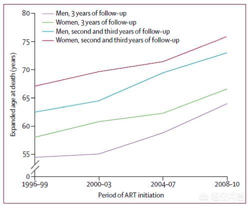 (図1.異なるART暦サイクルにおけるHIV陽性男女の20歳時平均余命)