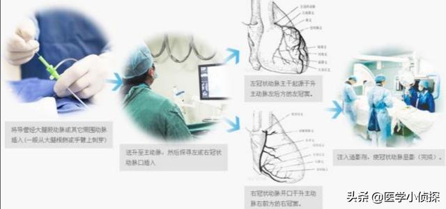 冠動脈造影とは、簡単に言えば、心臓カテーテルを用いて体の表在動脈を経皮的に穿刺することである。多くの場合、橈骨動脈または大腿動脈から穿刺し、動脈に沿って逆行性に上昇し、左冠動脈ポータルまたは右冠動脈ポータルに入り、そこで冠動脈を描出するために造影剤を注入する。