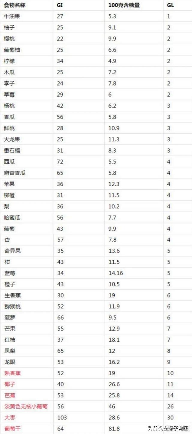 最後に、様々な果物の100グラムの糖度、血糖指数(GI)と血糖負荷(GL)が含まれている糖尿病患者に適した果物のリストを提供し、我々は血糖値の変化に影響を与えないために、一度に食べることができるどのくらいの果物を計算するために、この表の値に従うことができ、高血糖の人々のための果物の赤い種類のマーキングのために食べてはいけない。