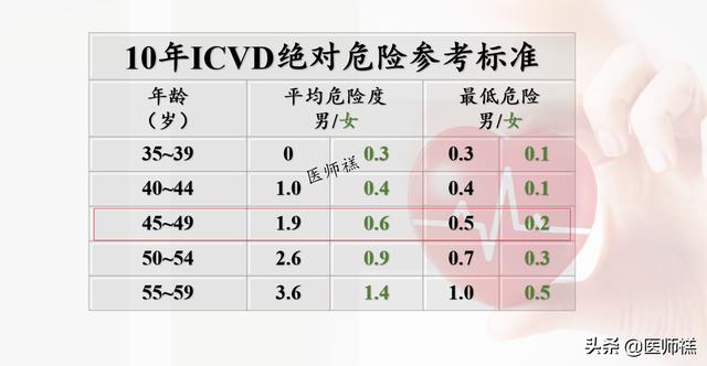 数値に基づく男女有病率の上記リスクはそれほど高くない。しかし、評価方法によれば、同年齢の健康な人(45歳時点での平均リスクレベルは男性で1.9、女性で0.6である。)。
