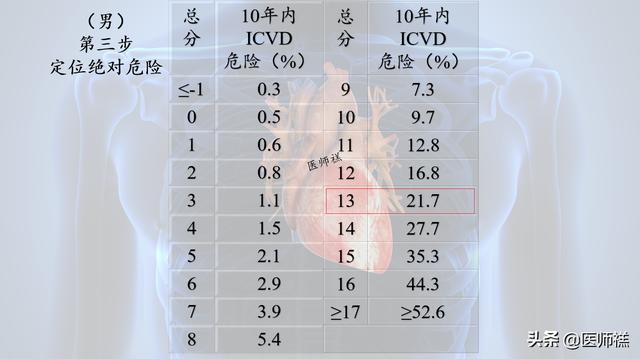 一方、男性のスコアが13であれば、今後10年間に虚血性心血管疾患の可能性があるリスクは21.7に相当する;