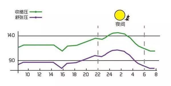 日中でも血圧は比較的規則正しく変動しており、2つのピークがある。 第1のピークは午前6時から10時で、起床後に交感神経の興奮が徐々に高まり、血圧は夜間の低い状態から徐々に上昇して第1のピークに達する。その後、血圧は下がり始め、谷を形成する。午後4時以降、代謝は徐々に最高レベルに達し、血圧は再び上昇し、午後4時から8時の間に第二のピークに達する。