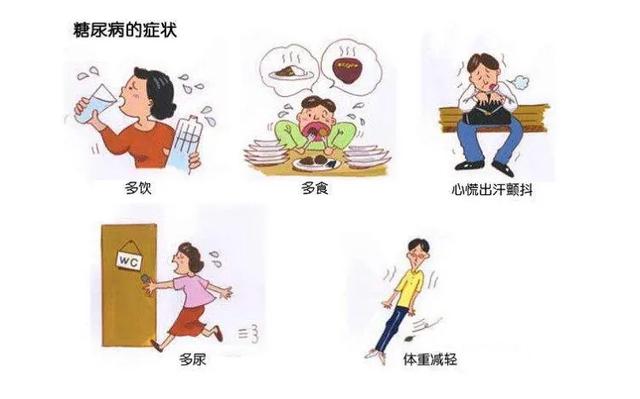 糖尿病の典型的な症状は、「三多くて一少」、つまり、飲酒量が増える、排尿量が増える、食べる量が増える、原因不明の体重減少である。