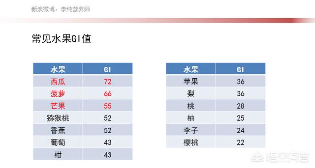 血糖指数(GI値)とは、ある種類の食品を摂取したときに起こる血糖反応のことで、GI値が高いほど、摂取後の血糖上昇が速く、逆もまた然りである。一般的な果物の血糖値は以下の表を参照し、糖尿病患者はGI値の低い果物を選んで食べることができ、毎日の食事も食品のGI値を参照することができます。