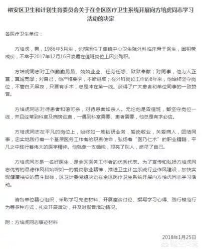 2017年の不完全な統計によると、メディアは、医師の突然死の31例を報告し、牙Peihu通知では、通知を発行する前日に学ぶために、青海大学附属セクションの救急部の医師郭Qingyuan夜勤は38人の患者を受信するために、18時間連続して働いて、救助に失敗した死の突然の病気の証拠。