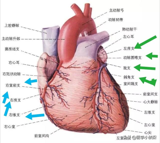写真の通り:左冠動脈は右冠動脈よりはるかに短く、左大動脈洞から起始し、前室間枝と回旋枝に分かれ、それらはさらに細分化される。一方、右冠動脈は右大動脈洞から起始し、右冠動脈溝に沿って走行し、心臓の右境界を迂回し、右辺縁枝、右房枝などに分かれる。