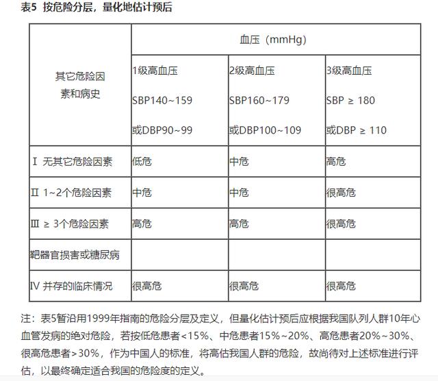 同時に、高血圧のリスクの程度と心血管疾患との間には非常に明確な正の相関があるため、高血圧も心血管疾患やその他の合併症の併発の有無によって、低リスク、中リスク、高リスク、超高リスクの4段階に分類されている。詳細は下表を参照、