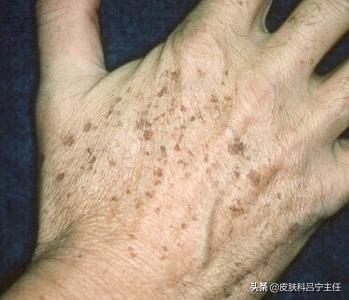 肝斑は一般に色が薄く、シミの縁は非常に不明瞭である。老人斑は一般的に色が濃く、縁がはっきりしていることが多く(明瞭)、初期は比較的小さく穏やかな褐色の斑点で、時間の経過とともに大きく厚くなり始め、表面がザラザラして突出し始め(触ることができる)、さらには明らかな突起ができ、一部は老人性疣贅(学名:脂漏性角化症)に変化し、さらに大きく濃い斑点に発展します。