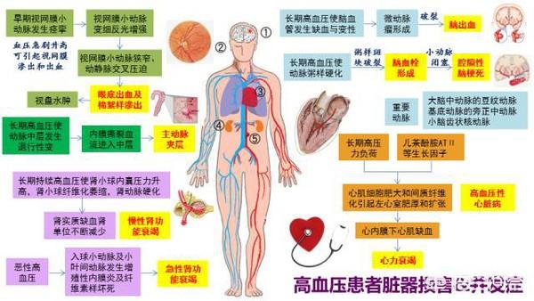 血圧の持続的な上昇は、主に心臓、脳、腎臓、全身の血管などの標的臓器にダメージを与え、最終的には脳卒中、心筋梗塞、心不全、腎不全、大動脈梗塞などの合併症を引き起こす。 降圧治療の目的は、高血圧患者の血圧を目標値に近づけ、脳卒中、急性心筋梗塞、腎疾患などの合併症や死亡のリスクを減らすことである。