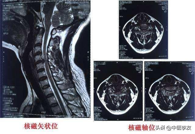 レントゲン写真を見ると、頚椎椎間板ヘルニアと頚椎骨棘があるが、この2つは頚椎の痛みと手のしびれの主な原因ではない。