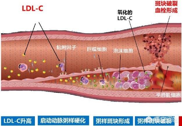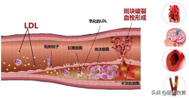 生活習慣の変化に伴い、血液中にフリーラジカルや有害酵素が沈着し、血流によって血管内皮が傷つきやすくなり、血液中の脂質(主に低比重リポ蛋白コレステロールLDL-Cとコレステロール)が血管内皮に入り込んで酸化され、炎症反応を起こし、低比重リポ蛋白コレステロールを貪食するマクロファージが活性化する。しかし、マクロファージにはLDLコレステロールを分解する能力はないため、大量のLDLコレステロールを貪食したマクロファージは泡沫細胞に変化し、血管内皮に沈着しておかゆのような黄色い粒子が詰まった硬化斑を形成する。同時に、プラークは線維性被膜で覆われており、これはプラークの安定性を維持する上で重要である。20年、30年経つとプラークは成長し、沈着する。 過度の疲労、喫煙、感情的ストレス、怒り、アルコール中毒、高体温などの特定の要因が線維性被膜の破裂を促進し、プラークの流出やさまざまな閉塞を引き起こし、さまざまな心血管疾患や脳血管疾患を引き起こす。