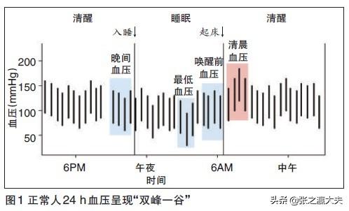二重のピークと一つの谷」とは、日中に二つのピークがあることを指し、「二重のピーク」とは、起床後2~3時間が最初のピーク、午後4~6時が2番目のピーク、「一つの谷」とは、夜間睡眠中の血圧が日中睡眠に比べて10~20%低下することを指す。二重ピーク」は起床後2~3時間が最初のピークで、2番目のピークは午後4~6時、「谷」は夜間睡眠中の血圧が昼間と比べて10~20%低下することを指す。この血圧曲線は「アリエピグロット血圧」とも呼ばれる。