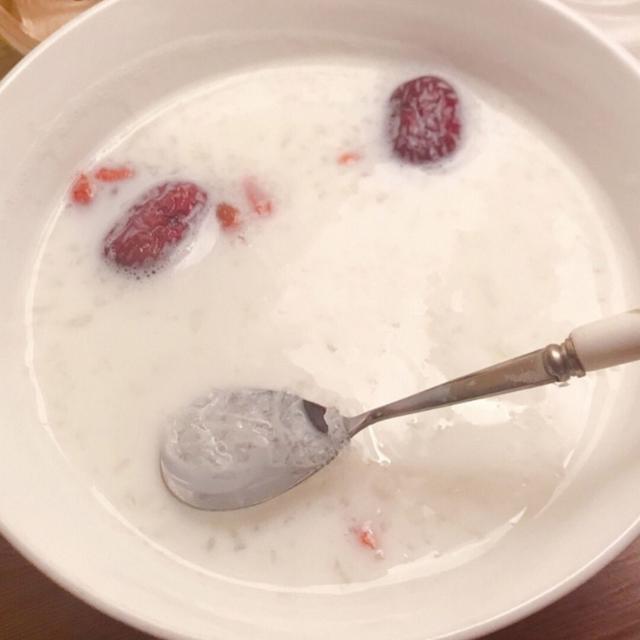 実践:赤いデーツ、ゴジベリー、ユリを鍋に注いで調理し、牛乳を注ぎ、よくかき混ぜ、鳥の巣と氷砂糖は、その上によくかき混ぜる時間までほとんど!