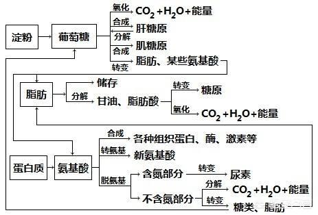 上の図が理解できなくても、糖質、脂質、タンパク質が私たちの3つの基本的な栄養素であり、体内での代謝は相互に関連し、相互に変換されていることを理解していれば問題ない。しかし、それらが互いに変換される場合は異なる。例えば、糖が十分に供給される場合には、脂肪に大量に変換され、非必須アミノ酸のアミノ酸にも変換される。しかし、脂肪は大量に糖に変換されることはなく、糖の供給が不十分な場合には糖に変換されることがある。タンパク質は糖質と脂質の両方が必要不十分なエネルギー供給は糖にしか変換されない。
