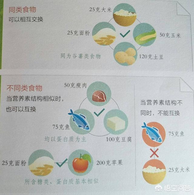 4.食品交換で血糖値を正常化する。食品交換量法:1交換量=90kcal。穀類・イモ類、野菜類、果物類、赤身肉類、大豆・牛乳類、油脂類。各カテゴリーの中で、90kcalを摂取できる食品の重量を交換量とし、似たような食品同士を交換することができる。つまり、1日の総カロリーを増やさずに、等カロリー・同栄養素の原則に従って、食品同士を交換することができる。