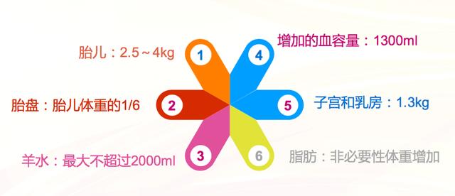 妊娠中に必要な体重増加には、胎児、胎盤、羊水、血液量の増加、乳房および子宮の増大が含まれる。胎児は約2.5~4kg、胎盤は胎児の体重の約1/6(約0.5kg)、羊水は最大2,000ml、血液量は約1,300ml、子宮と乳房は1.3kg増加し、残りは必要でない脂肪体重増加である。