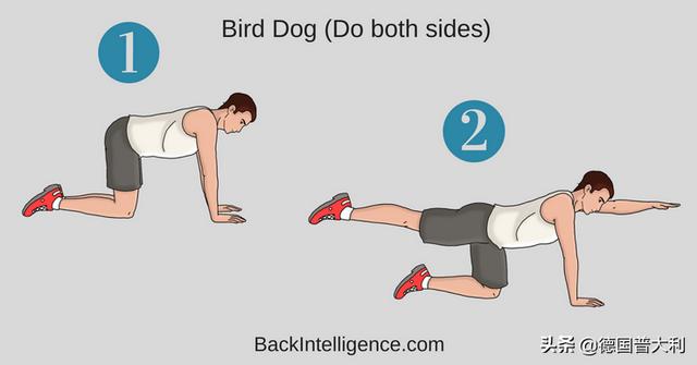 下の写真のように、片方の手と反対側の足を持ち上げるときに、腰が崩れないように、骨盤が回転しすぎないように注意しながらトレーニングするとよい。