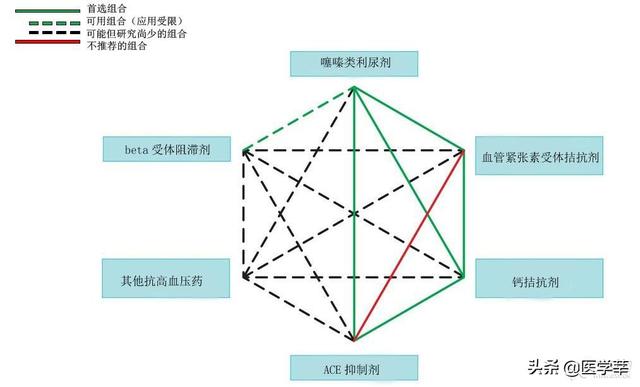 薬剤の併用は不合理である。病気の進行に伴い、ほとんどの高血圧患者は薬の併用を必要とする。つまり、降圧薬と他の薬の併用が基本であるが、すべての降圧薬が同じ降圧機序の薬を併用できるわけではない。例えば、ニフェジピンとアムロジピンは、どちらも降圧効果は高いが、血圧降下の末梢動脈の拡張を介した降圧機序は同じであるため、併用することはできない。サルタン/プリリジー降圧薬とβ遮断薬(メトプロロールなど)の降圧機序は異なるが、その降圧機序は一部重複しており、併用後の降圧作用の重畳は好ましくないため、好ましい併用降圧療法には属さない。プリリジー降圧薬とβ遮断薬は心筋梗塞による死亡リスクを低下させることができるため、関連する心病変を有する患者は両者を併用することが可能であり、予後の改善が重視される。現在、望ましい降圧薬の併用療法は、ジフェンヒドラミン+プリロセック/サルタン降圧薬、プリロセック/サルタン降圧薬+利尿薬、ジフェンヒドラミン+利尿薬、ジフェンヒドラミン+β遮断薬である。
