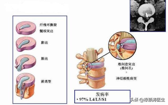 次に、やはり腰椎の椎間板ヘルニアである。圧力が高くなると、腰椎椎間板の線維輪が圧力に耐えられなくなり、外側の線維輪が破裂し、その時点で内側の髄核が流れ出します。髄核の材質は非常に特殊で、痛み神経を持たないが、神経根に触れると神経に明らかな痛みを生じさせる。