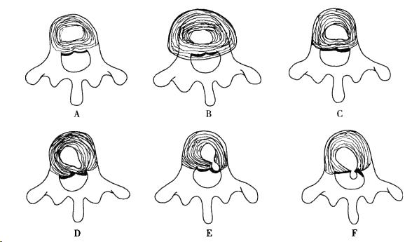 F.遊離椎間板。髄核は完全に断裂した環状線維とその後靭帯を通過し、脊柱管内で遊離する。