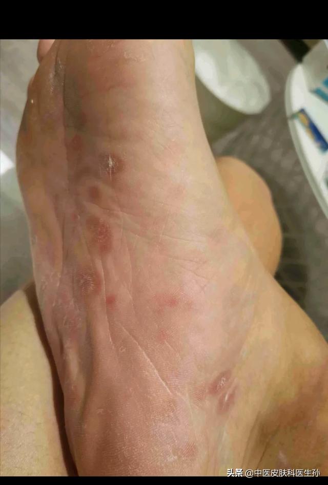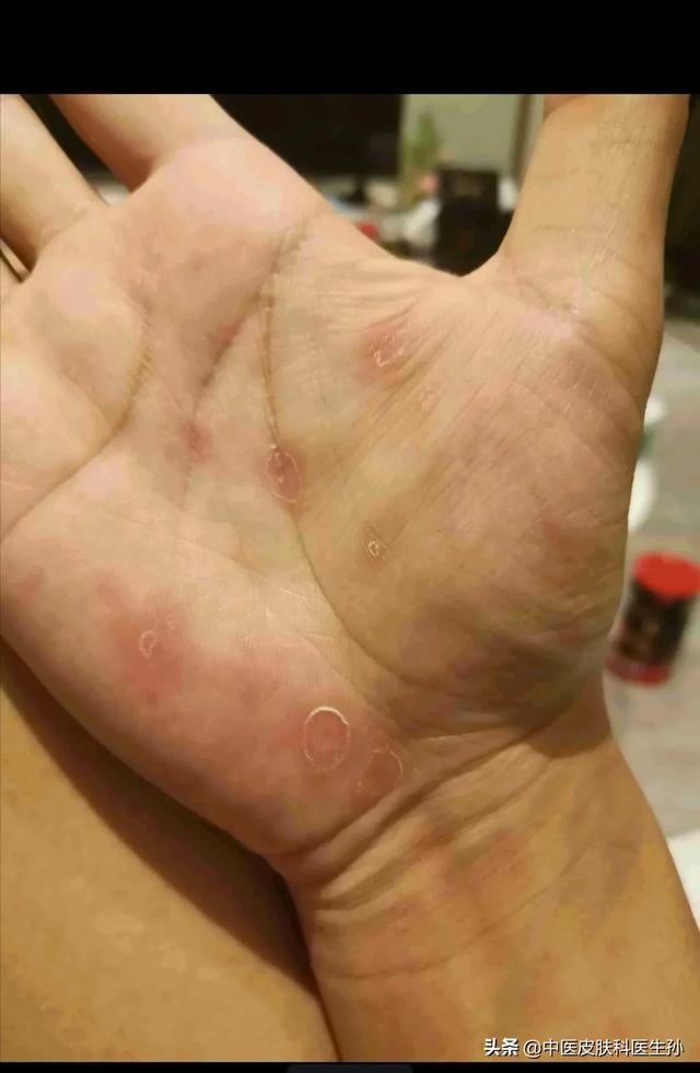 二つ目は、左右対称の赤い発疹が全身にできることである。この種の赤い発疹も豆粒大から硬貨大で、顔にはあまり出ませんが全身に出ることがあり、手のひらや足の裏にも出るのが典型的な特徴です。赤い斑点の表面はカサカサしていて、痛みやかゆみはなく、1~2ヵ月後には自然におさまります。II期梅毒とも呼ばれます。