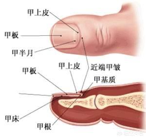 爪の硬い部分は爪甲と呼ばれ、爪甲は爪床と呼ばれ、爪床の近位端、つまり指の甲に近い部分は近位爪ヒダと呼ばれ、その下が爪の根元で、最後の端が爪母で、爪は爪母から少しずつ伸びていく。