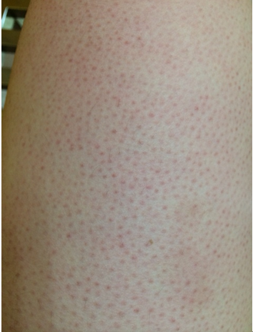 "鶏皮 "とは民間名で、鶏の皮のようにつるつるしておらず、ざらざらしているという意味である。実際、鶏皮は医学的には毛包周囲角化症と呼ばれるもので、毛苔とも呼ばれ、主に美容適齢期の若い男女に見られる。一般に、毛包周囲角化症は頬の両側、両上腕の外側、臀部、太ももの外側にあり、ニキビの上部には灰色の角栓がある。時には、浸透の中心部に崔毛や内側にカールし、ケラチンプラグを剥がし、目に見える小さなカップ状の窪み。断片に密集し、木材やすりのような感触、比較的粗い。冬はやや重く、夏はそれほど重くなく、冬は皮膚のかゆみを伴うことが多い。その理由は、汗をかく夏は皮膚が乾燥し、汗をかかない冬は皮膚が乾燥するからである。