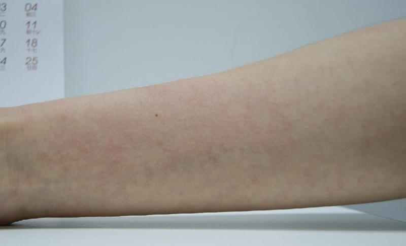 (2)かゆみを伴う発疹:緑豆大から大豆大の丘疹、結節、掻破、かさぶた、剥がれ落ちる二次的損傷が散在する皮膚、強いかゆみ、非感染性。