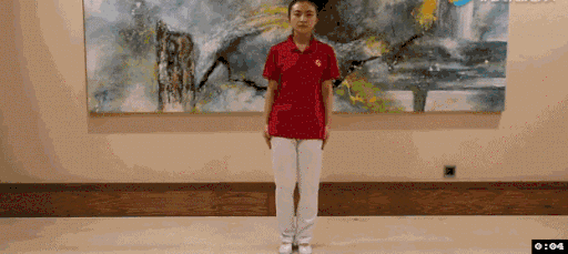 足を肩幅に開き、馬の姿勢でしゃがみ、両手は空拳を持ち、膝関節の内側の上から4拍、鼠径部へ倒し、次に胆経へ回し、輪跳び点から4拍、膝関節の外側の上へ倒し、ゆっくりと引っ込める。