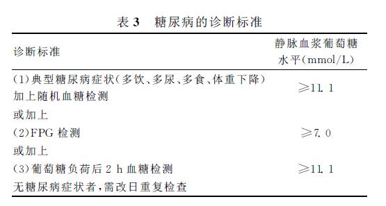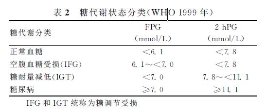 糖尿病の診断は、主に空腹時血糖値(FPG)と食後2時間糖負荷試験(OGTT)に基づいて行われる。以下は、世界保健機関(WHO)の糖代謝異常と糖尿病の診断基準である。