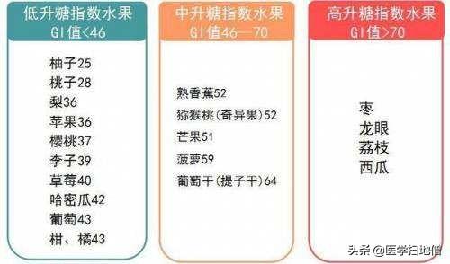 レモン、アプリコット、チェリー、グレープフルーツ、モモ、リンゴ、ナシ、ミカン、キウイなどのグリセミック指数の低い果物のように、これらの果物は適度に食べることができますが、マンゴー、パイナップル、スイカ、ナツメ、サトウキビなどのグリセミック指数の高い果物のために、消費に注意してください、そのような柿、カンタロープ、シナモン、ならびに加工ドライフルーツ、ドライフルーツ、砂糖漬けの果物などの果物のグリセミック指数の高いために、これらもう手を出さないことだ。