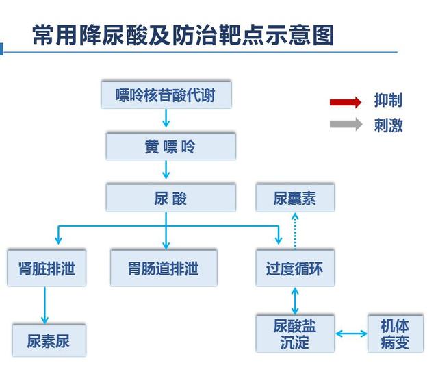尿酸の蓄積は、その90パーセントが尿酸の排泄障害によって引き起こされる。したがって、尿酸の体内排泄を促進することが特に重要である。高尿酸による更なるダメージを軽減するために、患者は血中尿酸値を下げる薬を服用する必要がある。