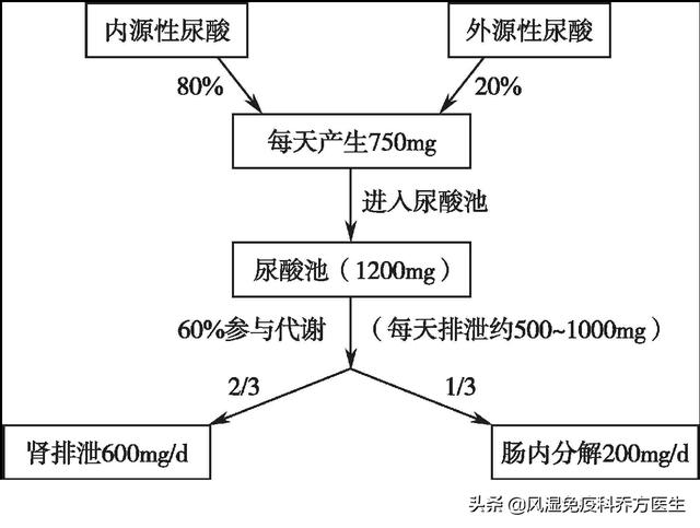 放射性核種トレーサー研究により、正常な体内の尿酸プールは平均1,200mgで、1日あたり約750mgが産生され、500~1,000mgが排出され、約2/3が尿から排泄され、残りの1/3は腸から排出されるか、腸管内の細菌性尿酸オキシダーゼにより分解されることが示されている。
