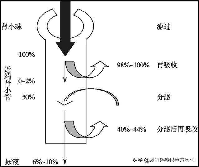腎尿酸排泄の低下は、糸球体尿酸濾過の低下、尿細管再吸収の亢進、尿細管尿酸分泌の低下など、高尿酸血症の重要な因子である。これまでの研究では、高尿酸血症の形成は主に腎尿細管分泌の低下によるものと結論付けられていた。最近の研究では、尿細管での尿酸再吸収の亢進も重要な役割を果たしていることがわかってきた。
