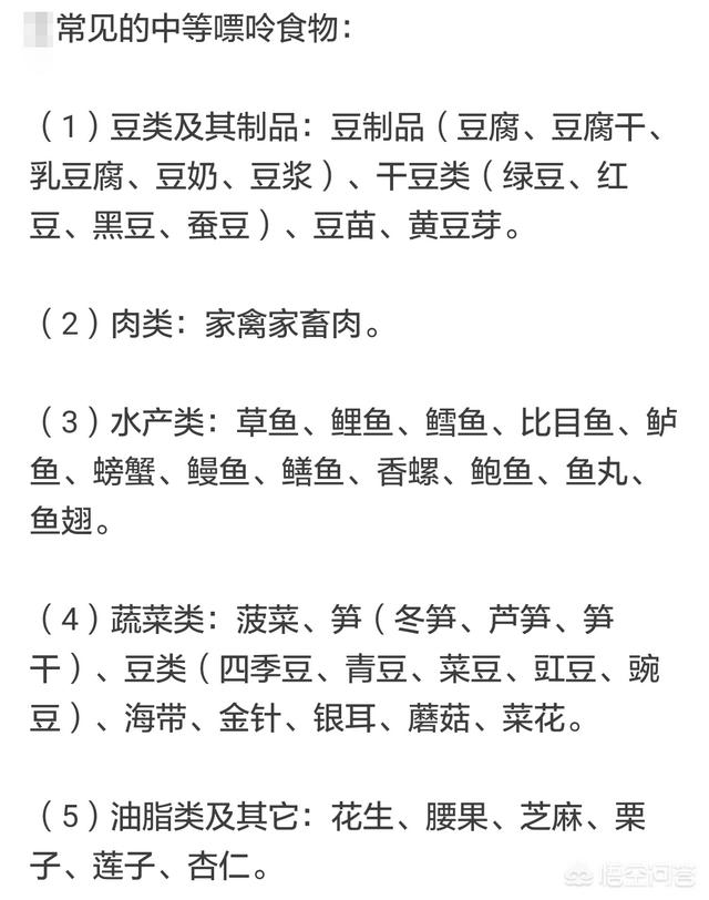 大豆および大豆製品:大豆の皮、豆腐、豆乳、豆味噌、インゲン豆、小豆、大豆苗など;肉類:豚肉、鶏肉、鴨肉、ウサギ肉など;魚介類:鯉、鯉、スズキ、オヒョウ、カニ、ウナギ、巻貝、アワビ、フカヒレなど;野菜類:ほうれん草、昆布、銀杏、レタス、アスパラガス、いんげん豆、ササゲ、えんどう豆など;ドライフルーツ:ピーナッツ、カシューナッツ、ゴマ、ライチ;