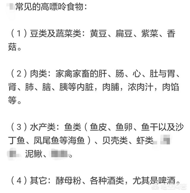 高プリン体食品:動物の内臓:心臓、肝臓、脾臓、肺、腎臓、腸、胃、脳など、一部の魚介類:ハヤ、魚の皮、魚卵、干物、イワシ、アンチョビなど、貝類、エビなど、各種肉スープ:濃厚な肉スープ、鶏ガラスープ、魚スープ、鍋など、野菜:大豆、レンズ豆、海苔、椎茸など;