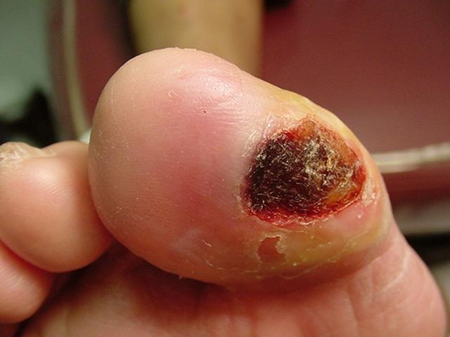 糖尿病は動脈の狭窄や閉塞を合併しやすく、その結果、足への血流が減少し、ひどい場合には足壊疽を起こすこともある。