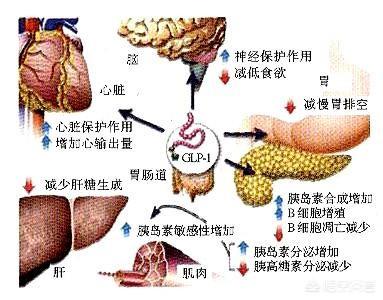 GLP-1は、インスリン遺伝子の転写を促進し、インスリンの合成と分泌を増加させ、膵島B細胞の数を増加させ、グルカゴンの分泌を抑制し、胃内容物の排出を遅延させ、食欲を抑制する。