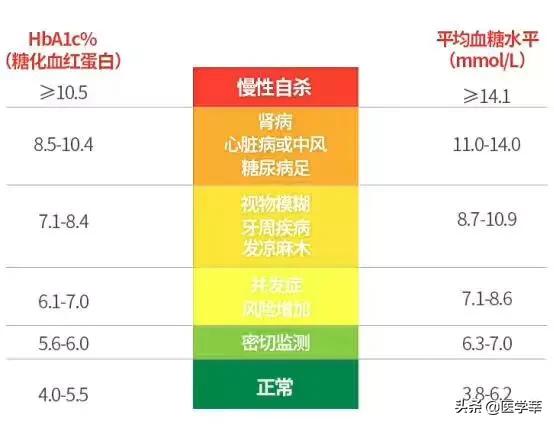 一方、慢性合併症は長期にわたる慢性的な血糖上昇に起因する。血糖値の平均値は糖尿病合併症と正の相関があることがわかっている。 したがって、糖尿病を評価する場合、単一の血糖値だけでは血糖のコントロールを評価できず、平均的な血糖を反映する値、すなわち糖化ヘモグロビン値が必要となる。糖化ヘモグロビンとは、血液中のヘモグロビンが血糖にさらされたときに起こる糖化の化学反応であり、測定できるのは過去3ヶ月間の血糖値の平均値である。血糖値が正常であれば、糖化ヘモグロビンの値は正常です。私たちは通常、この値を使って血糖コントロールが標準に達しているかどうかを測定し、また薬物療法を開始するか調整するかを決定します。