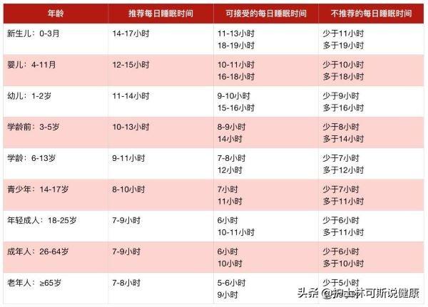 各年齢の睡眠時間は以下の表で確認できる: