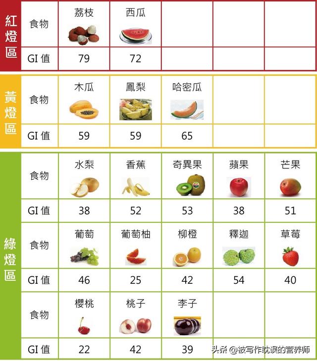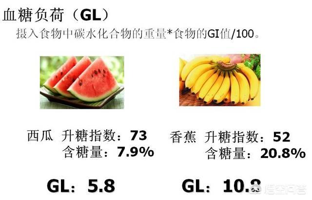 リンゴ、ナシ、モモ、オレンジ、グレープフルーツ、イチゴ、サクランボ、そして一般的に食べられているブドウなどの果物は低グリセミック指数(GI)の果物で、血糖負荷量も低い。バナナでさえ、グリセミック指数(52)は高くなく、血糖負荷量(12)が少し高いだけである。スイカはグリセミック指数(72)は高いが、スイカは水っぽく、同じ量のスイカの血糖負荷量(4)は高くない。したがって、このような果物は食べてもよいが、選択的に限られた量を食べるべきである。