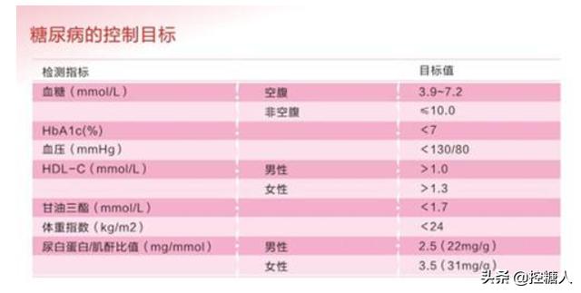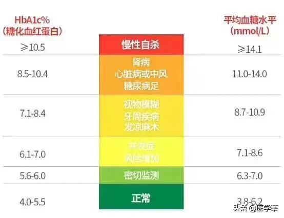糖化ヘモグロビンの管理基準は、患者の病型、罹病期間、心血管疾患の併存状況、余命、合併症によって絶対評価される。中国の2型糖尿病予防管理ガイドライン2017年版では、糖化ヘモグロビンを7%未満に管理することが明記されている。慢性末期腎不全心肺機能不全、悪性腫瘍、精神異常のある患者には8.5%まで緩和できる。また、糖尿病の既往歴が短く、平均余命が長く、心血管疾患のない患者については、低血糖を起こすことなく糖化ヘモグロビンを6.5%以下にコントロールすることが可能であり、妊婦の血糖値はもう少し厳しくなければならない。