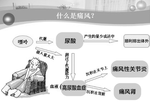 高尿酸血症が長く続くと、患者はこの異常な尿酸濃度に適応してしまい、尿酸が薬物や尿酸降下薬によって正常値まで低下した後、高尿酸血症が再発することが多い。身体はまた尿酸が足りなくなったと勘違いする。そうすれば体内の尿酸貯蔵庫を動員して血中尿酸を血流に放出し、この放出が痛風発作を誘発する。!
