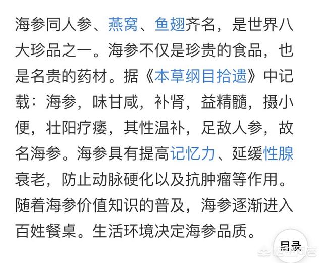ナマコは貴重な資本財であり、ナマコは魚類に属さず、毛もなく、ナマコは甘く、塩辛く、温かく、腎精を補い、血を養い、乾燥を潤す効果がある。栄養素が豊富で、高タンパク低脂肪食品に属する。強い強壮作用がある。