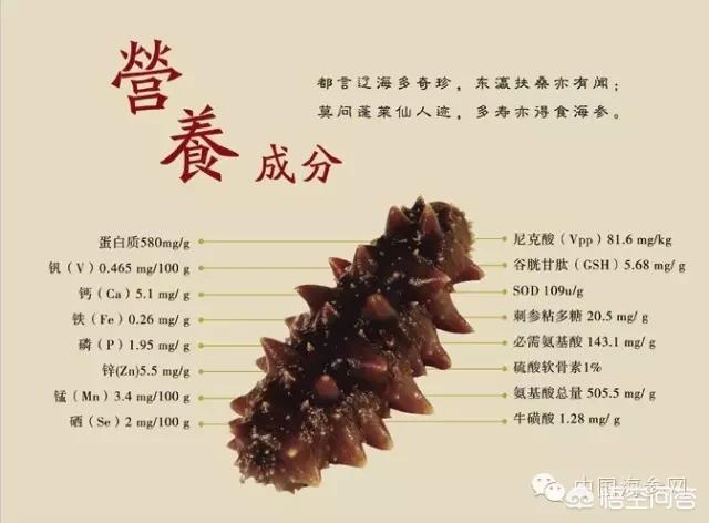 ナマコは栄養素が豊富で、高タンパク低脂肪食品に属し、強い強壮効果がある。乾燥ナマコ100gあたり50.2gのタンパク質を含み、セレン、マグネシウム、亜鉛、カリウム、鉄、リンなどのミネラルも豊富で、マグネシウムは1047mgも含まれている。