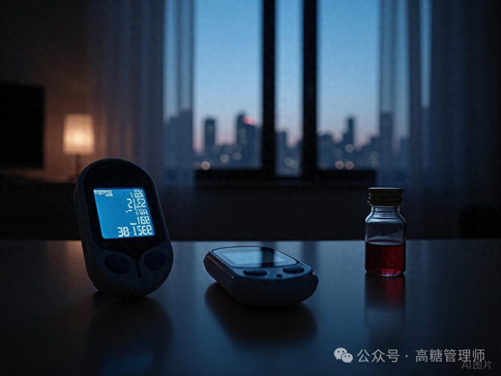 夜が更け、街の喧騒が次第に遠のく中、かつて不眠と血糖値の悩みに苦しんだ中年男性が静かに就寝の準備を整えている。ベッドサイドの血糖測定器には理想的な数値が表示されていた——6.2mmol/L。